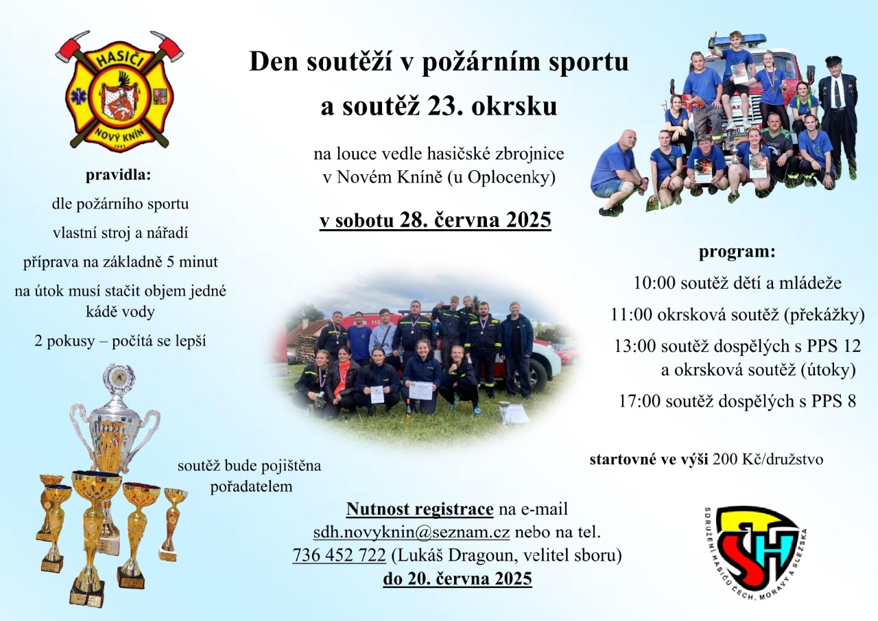Vzhledm k tomu, že letos na náš Sbor vyšlo pořádání okrskové soutěže, rozhodli jsme se náš klasický den soutěží spojit s okrskovou soutěží, a proto se vše uskuteční již v sobotu 28. června 2025 a to na louce vedle hasičské zbrojnice Nový Knín před Oplocenkou!!!